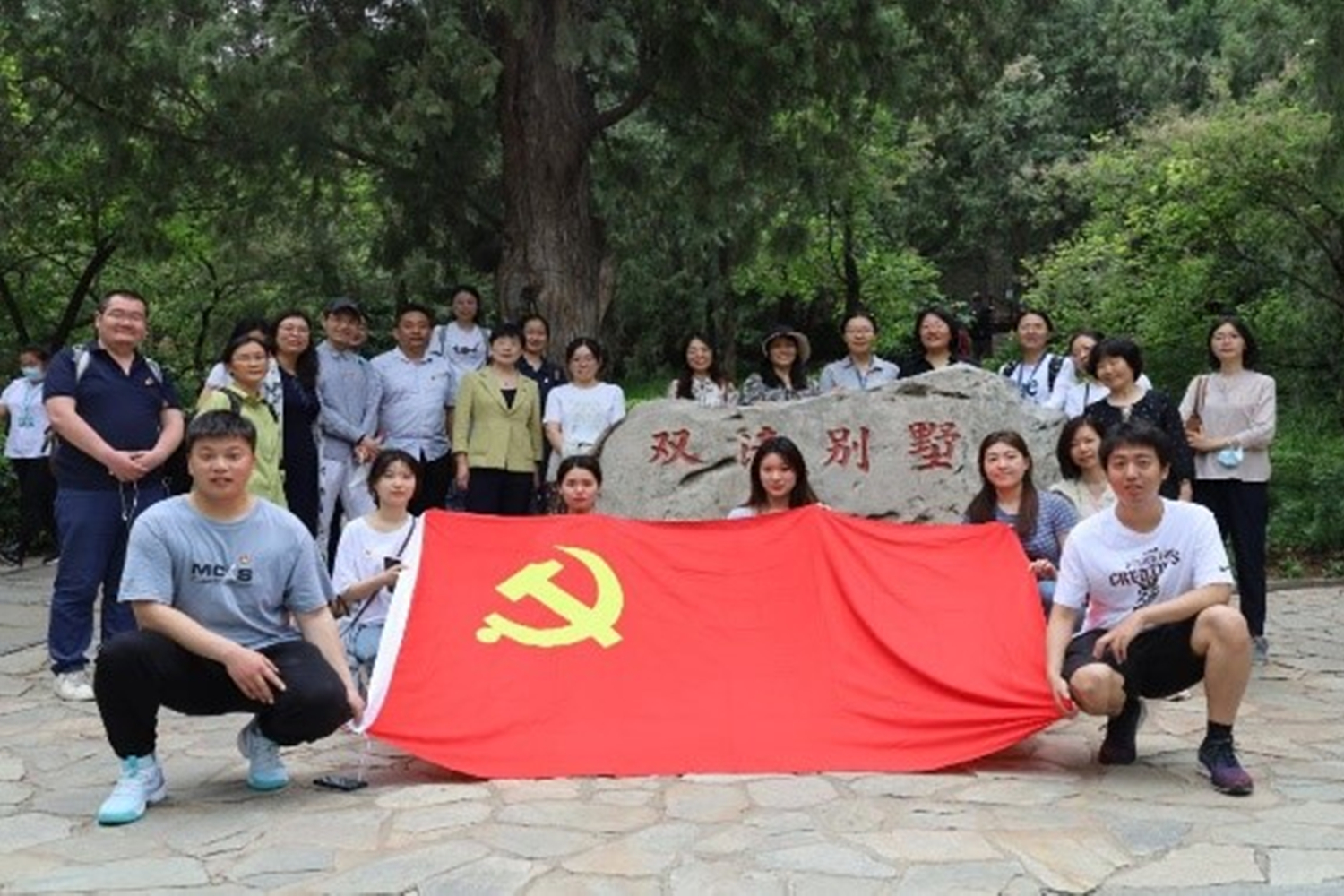 1949年3月25日,中共中央、中央军委机关进驻北平后,在双清别墅居住和办公。双清别墅是中国共产党“进京赶考”第一站,曾是中共中央的指挥中心,见证了中国革命走向胜利的历程。循着蜿蜒的山路盘旋,第一站抵达的是双清别墅的警卫处旧址。鲜艳的党旗矗立于院子中央,仿佛一盏不灭的明灯。公司党委书记周艳杰领誓,师生党员面向党旗重温入党誓词。