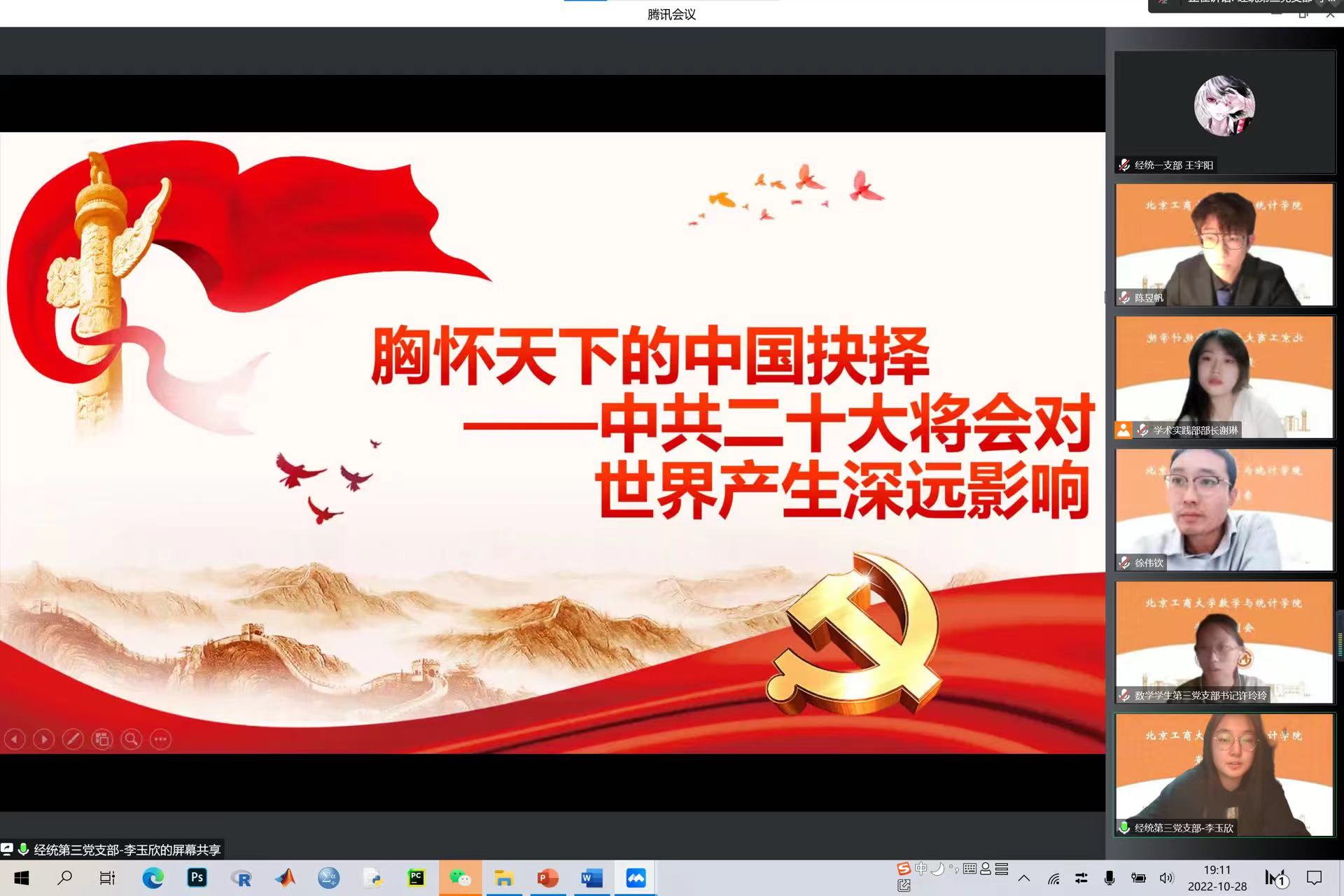 大会第二项,经统第三支部李玉欣阐述了党的二十大重要意义。党的二十大将对世界产生深远影响,发言主要集中于“以中国新发展为全球提供新机遇”,“丰富人类现代化路径选择的中国智慧”,以及“破解全球治理赤字的中国方案为核心”,体现了二十大以胸怀天下为基准,坚持以维护世界和平、促进共同发展的外交政策为宗旨,致力于推动构建人类命运共同体,推动建设更加美好的世界的愿望。