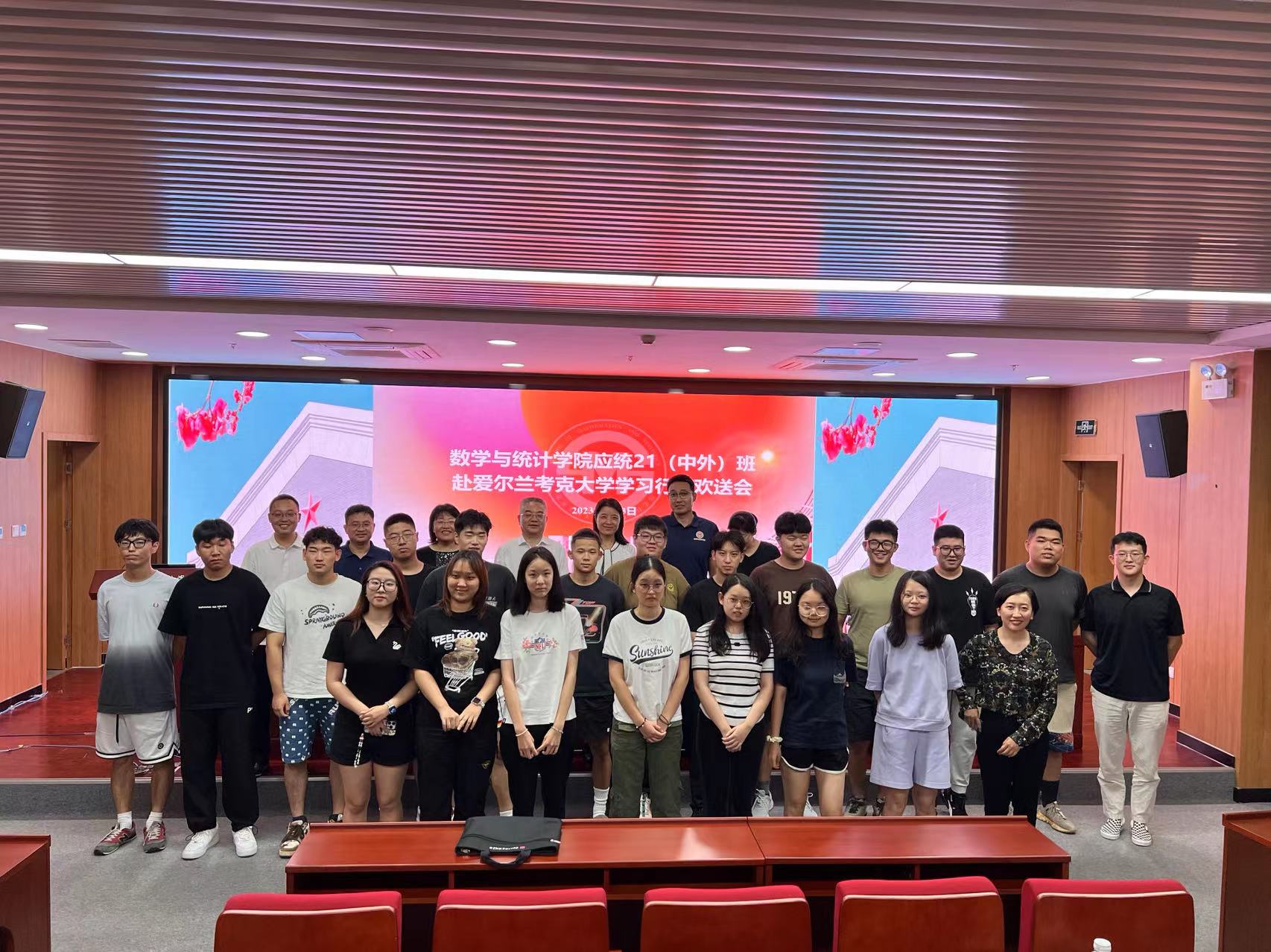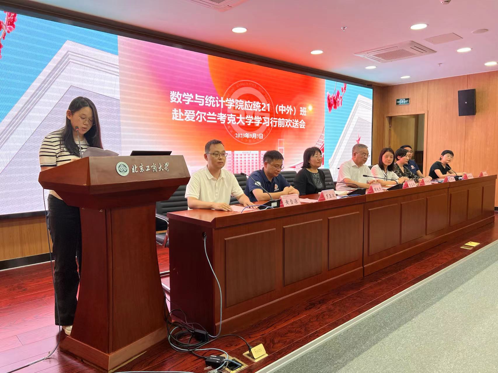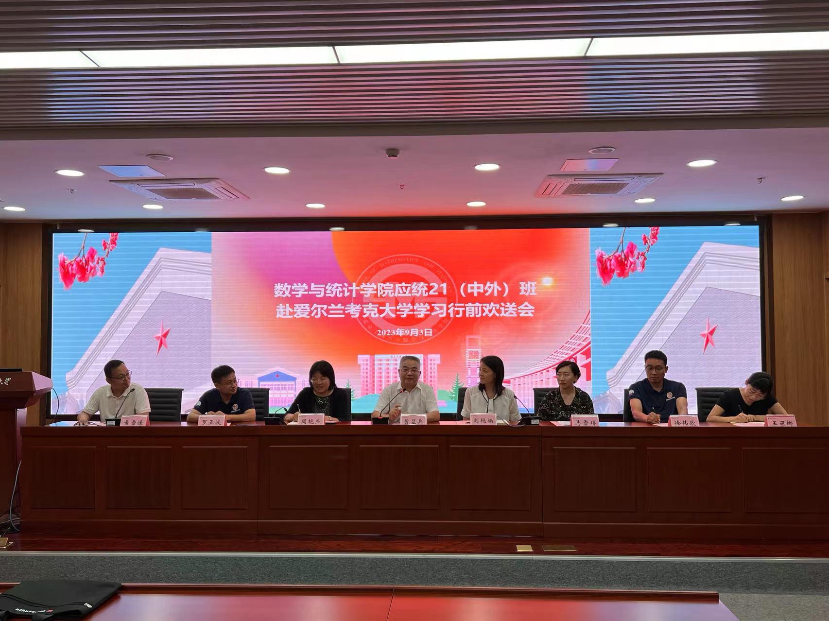yl23455永利中外合作办学(风险与精算)专业赴爱尔兰学习行前欢送会于3日在阜成路综合楼一层报告厅举行。教务处处长曹显兵、国际交流与合作处副处长马雪娇、公司党委书记周艳杰、经理刘艳楠、党委副书记徐伟钦、副经理罗玉波出席会议,辅导员及应统21(中外)班出国员工和家长参会,会议由yl23455永利副经理黄雪源主持。