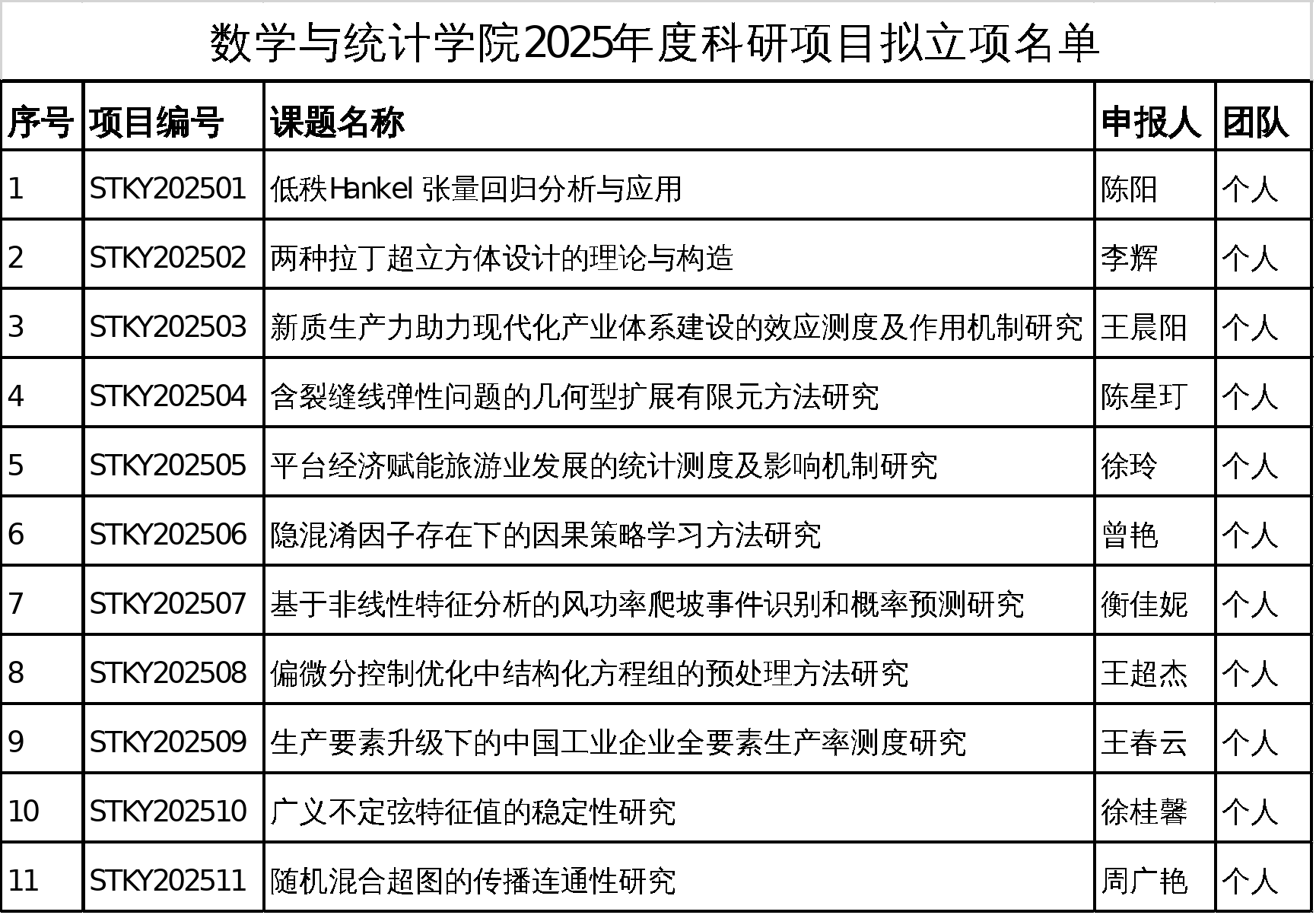 为进一步推动集团“双一流”创建和高水平研究型大学建设,加快统计、数学学科发展,助力高水平研究成果产出,根据公司相关文件精神,结合公司的实际情况,公司开展2025年度科研项目立项申报工作。依据《yl23455永利关于2025年度科研项目立项申报的通知》办法,优先资助无在研项目以及未被公司资助过的个人和团队,经过专家评审、党政联席会研究确定,2025年度院立科研项目拟资助名单如下: