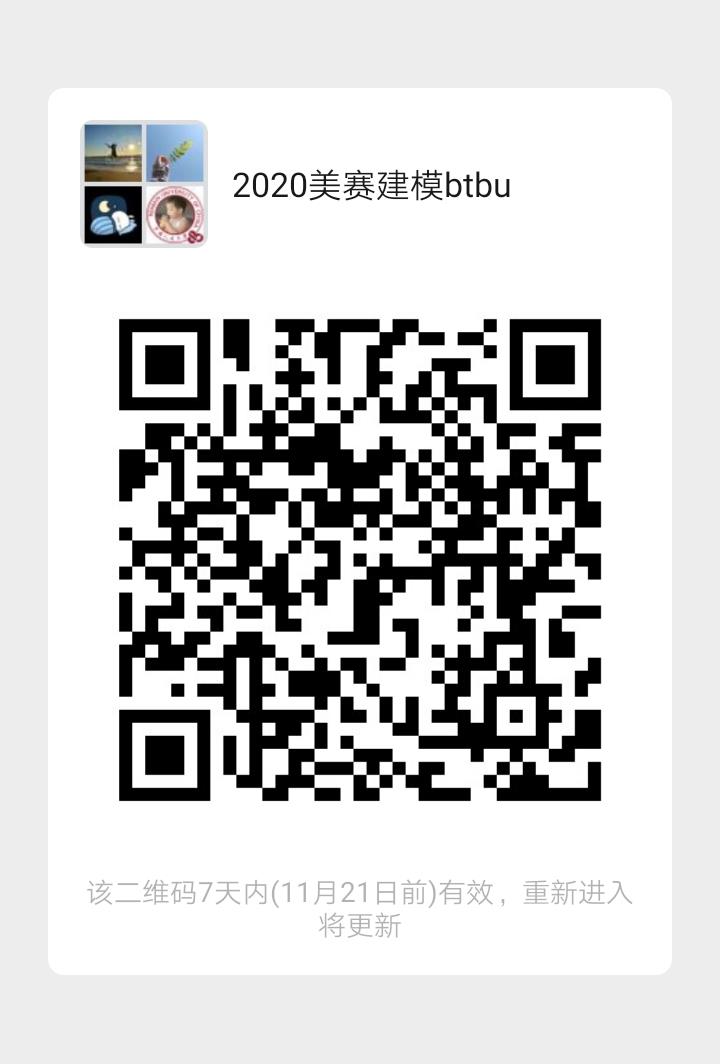 4.2由各参赛队队长扫描文后二维码进入微信群,以便接收公司通知;如无法进群,则添加微信号zhq91027,注明姓名、公司及2020美赛。后期培训及竞赛相关信息会在群里发布。