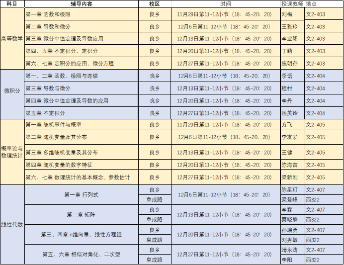 课后辅导时间为每周三晚上第11-12小节课(18:45-20:20)。其中,《高等数学》和《概率论与数理统计》从教学周第12周开始,至16周结束;《微积分》和《线性代数》从教学周第13周开始,至16周结束。课后辅导以知识总结、重难点归纳为主,辅以适量的习题讲解。欢迎大家参加。