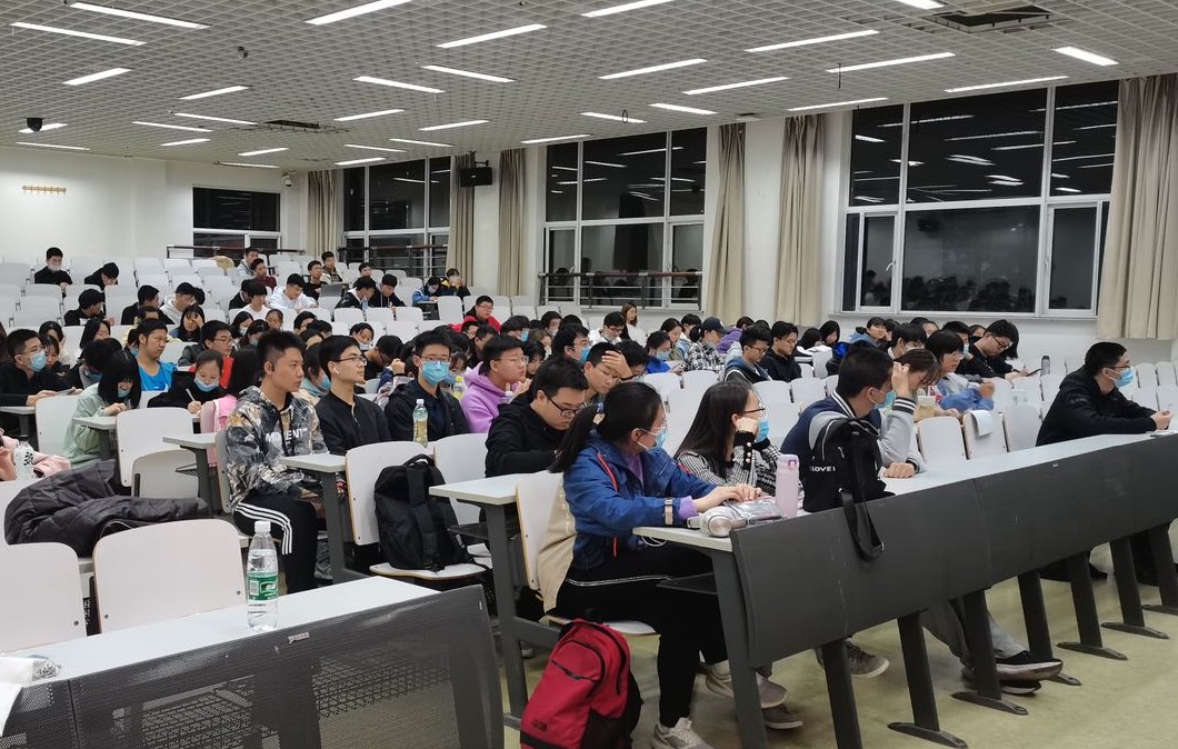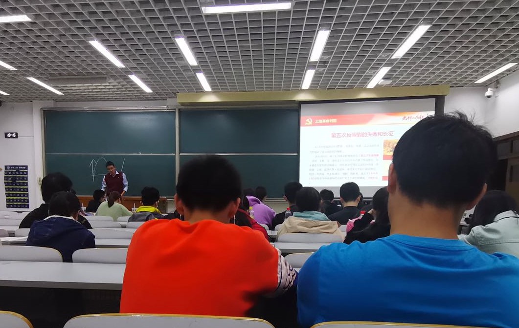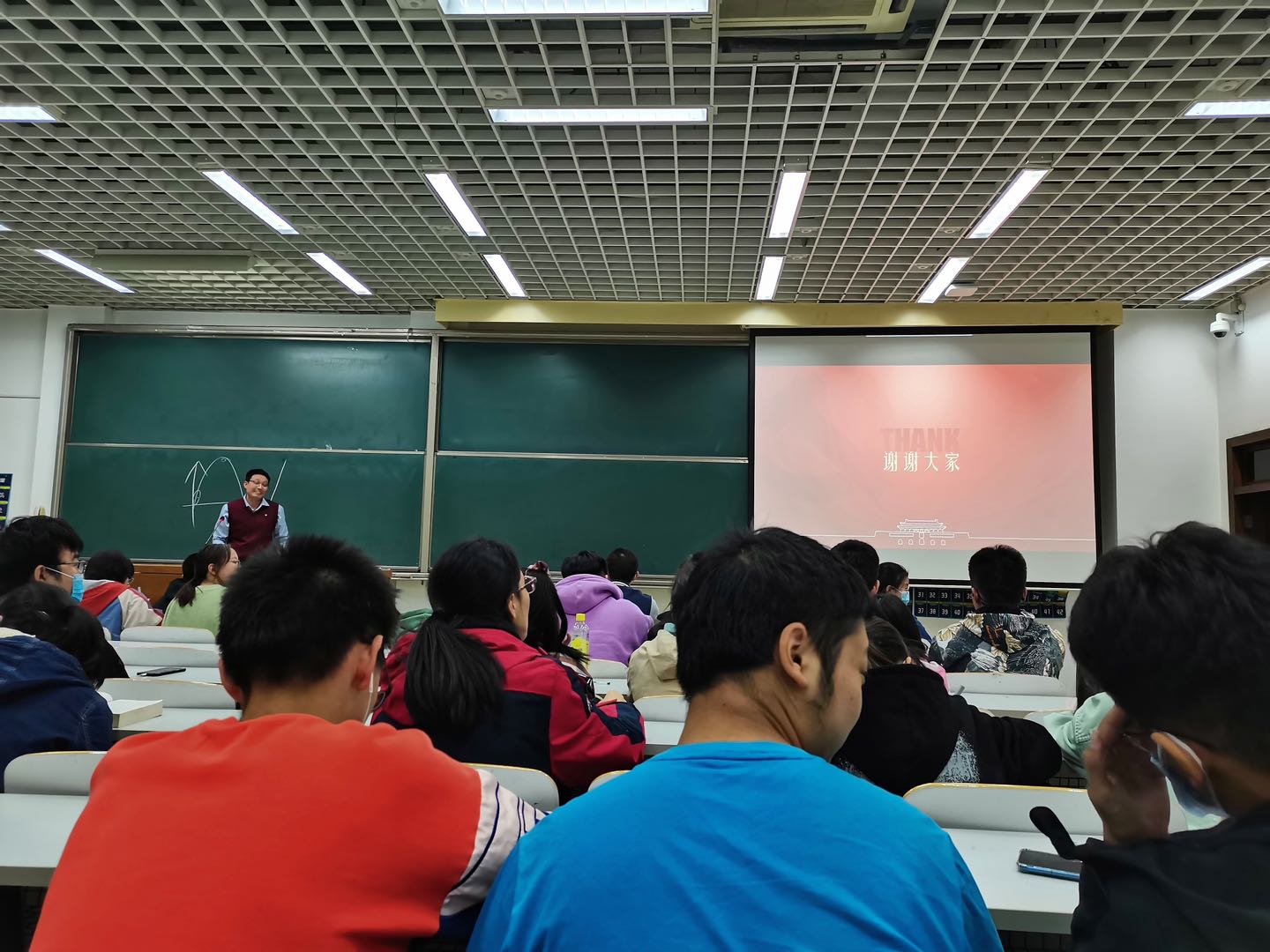 徐伟钦书记为新生多方面讲述了《中国共产党为什么行》。首先,书记在黑板上画了一条曲折的正函数线引发同学们的思考,并提出会议的主旨:中国共产党是在曲折中发展。