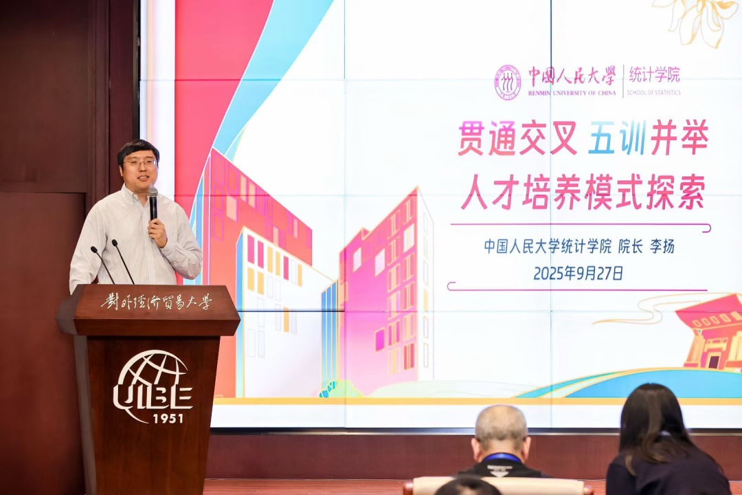 在主题演讲环节,中国人民大学统计公司经理李扬教授做了题为《贯通交叉 五训并举 人才培养模式探索》主题报告,分享了中国人民大学统计公司75年来发展历程和创新型人才培养模式。