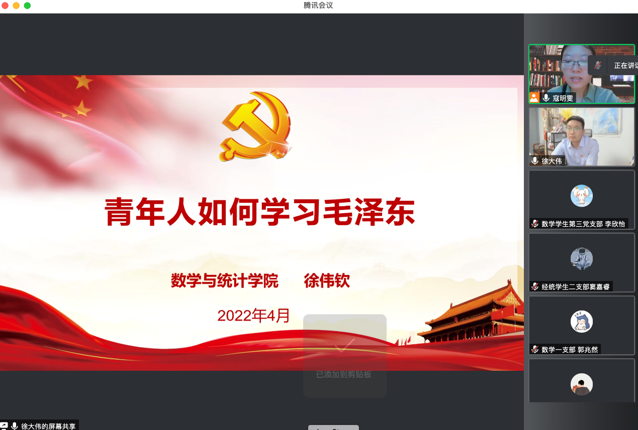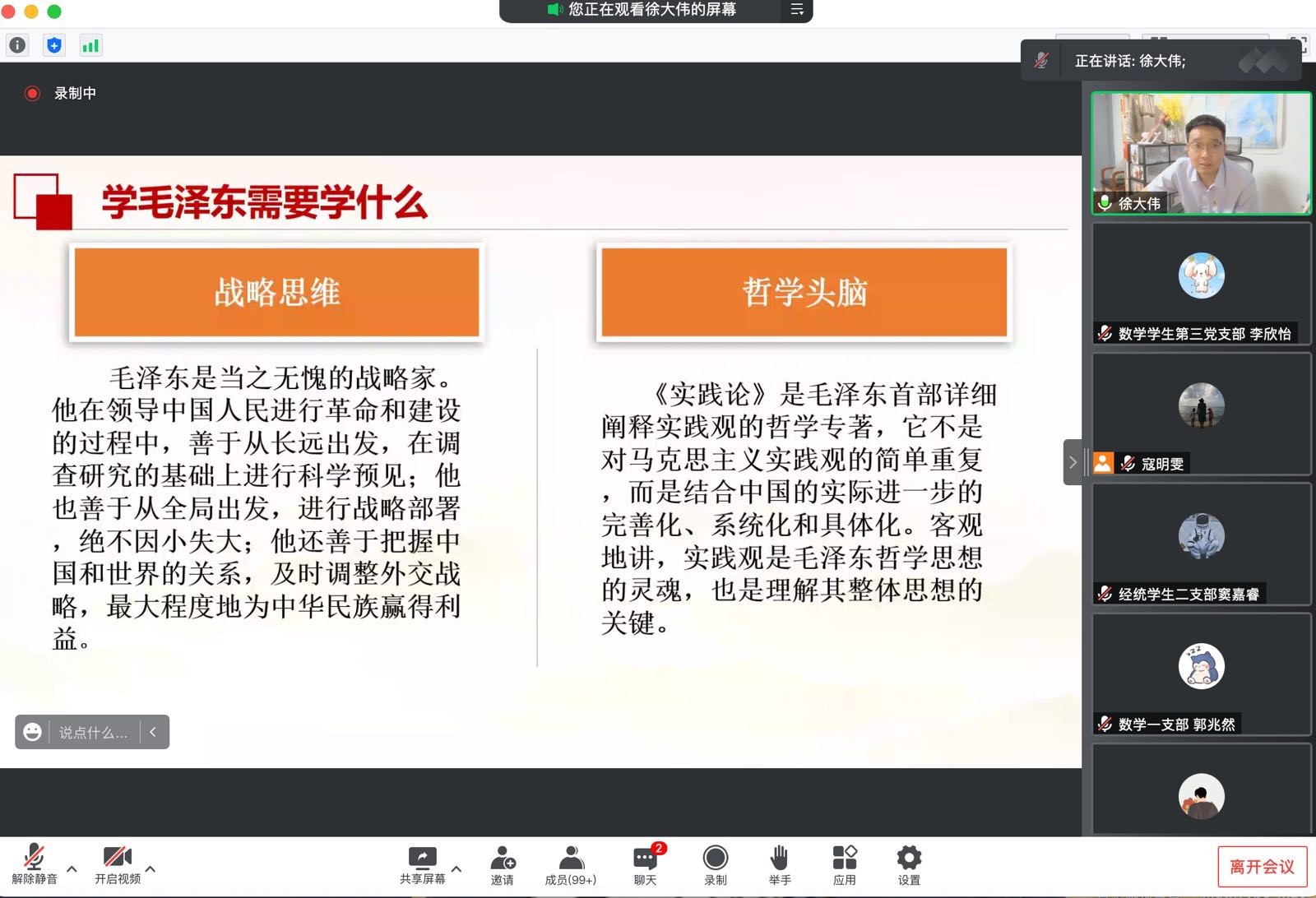 知道了为什么学习毛泽东之后,徐伟钦副书记又为大家讲解了“学什么、怎么学”的问题。18岁的毛泽东写了一篇《商鞅徙木立信论》的作文,一针见血地指出当时中国衰败的根本原因,论述了以民为本、取信于民的思想,可可见其目光深远、思想深邃。无论是“实事求是”的理论思想、“走群众路线”的方针政策,还是孜孜不倦地读书赋诗、“只能有一个中心工作”的工作方法,都值得我们青年认真学习。