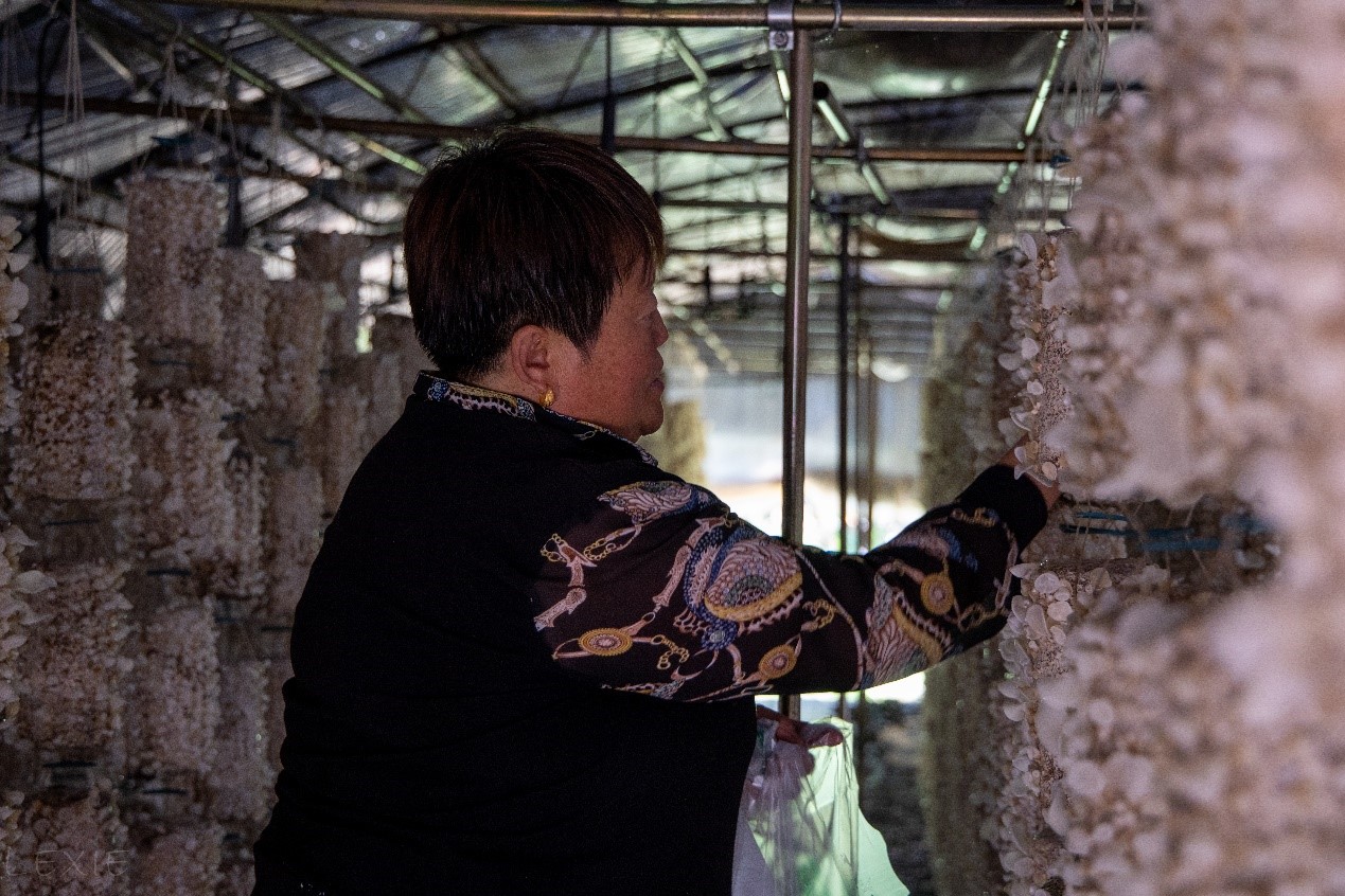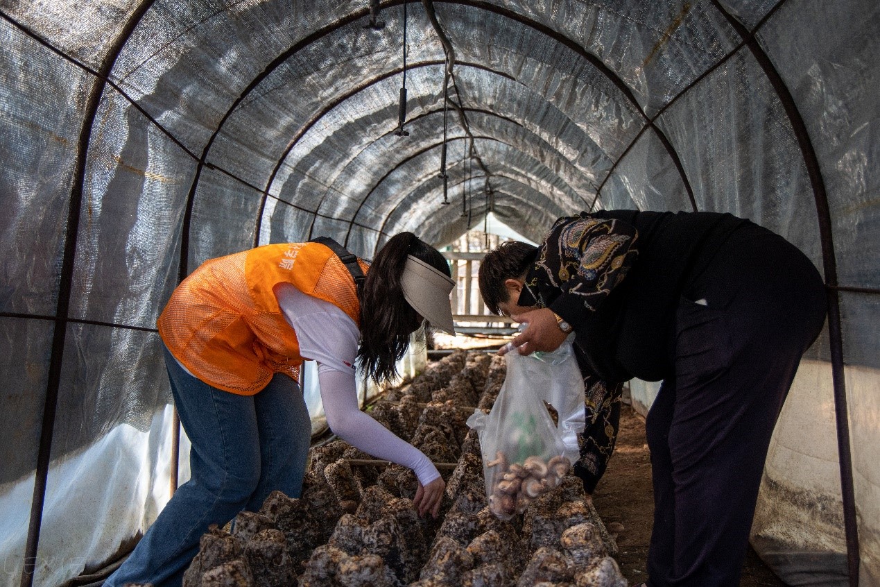 随后,实践团成员们来到东村食用菌种合作社参观。东村煤炭产业彻底关闭后,依托北京市农林科公司作为科技支撑单位逐渐发展林下食用菌生产,实现林菌生态互补。在科技小院专家的指导下,东村发展成为北京市食用菌一二三产融合的特色农业亮点,同时发展高端生态休闲旅游产业,开发多个特色蘑菇菜品,带动农家乐从事特色餐饮“蘑菇宴”,充分发挥“高端旅游+”功能,使旅游与文化、养老、农业等产业深度融合,带动村民增收,实现绿色转型。蒲洼东村立足林下食用菌产业经济,组建专家团队,筛选推广了榆黄菇、灰树花、黄伞、白灵菇、杏鲍菇、秀珍菇、红平菇、灵芝、玉木耳、鸡腿菇、奥德蘑等珍稀品种11个,食用菌种植面积已达300亩,年产食用菌120吨。当地合作社拥有完整的人员管理章程以及菌菇全产业链标准综合体,以“质量兴企,科技兴农,品牌立业,产业富农”为宗旨,以“服务首都,产业振兴”为目标。面对第一次接触菌菇生产的实践团成员,基地负责人向他们介绍了食用菌种的生产方式以及菌菇产业的对外贸易模式。在离开基地前,热情好客的东村人民还采摘了不同种类的菌菇送给实践团,以表达对大家到来的的欢迎。