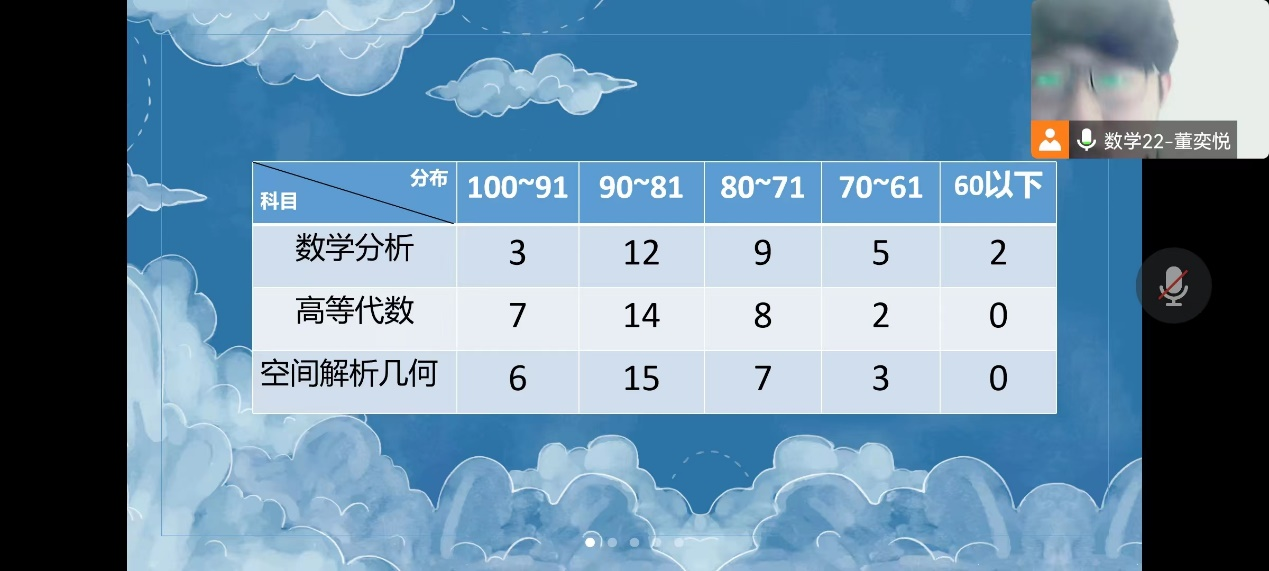 本次班会由班长董奕悦主持,首先对本班的专业课成绩进行了具体分析,具体以中间分段为多,有分数相对较高的,但数学分析存在挂科情况。随后对校级必修课成绩进行分析,并与往届成绩进行比对。