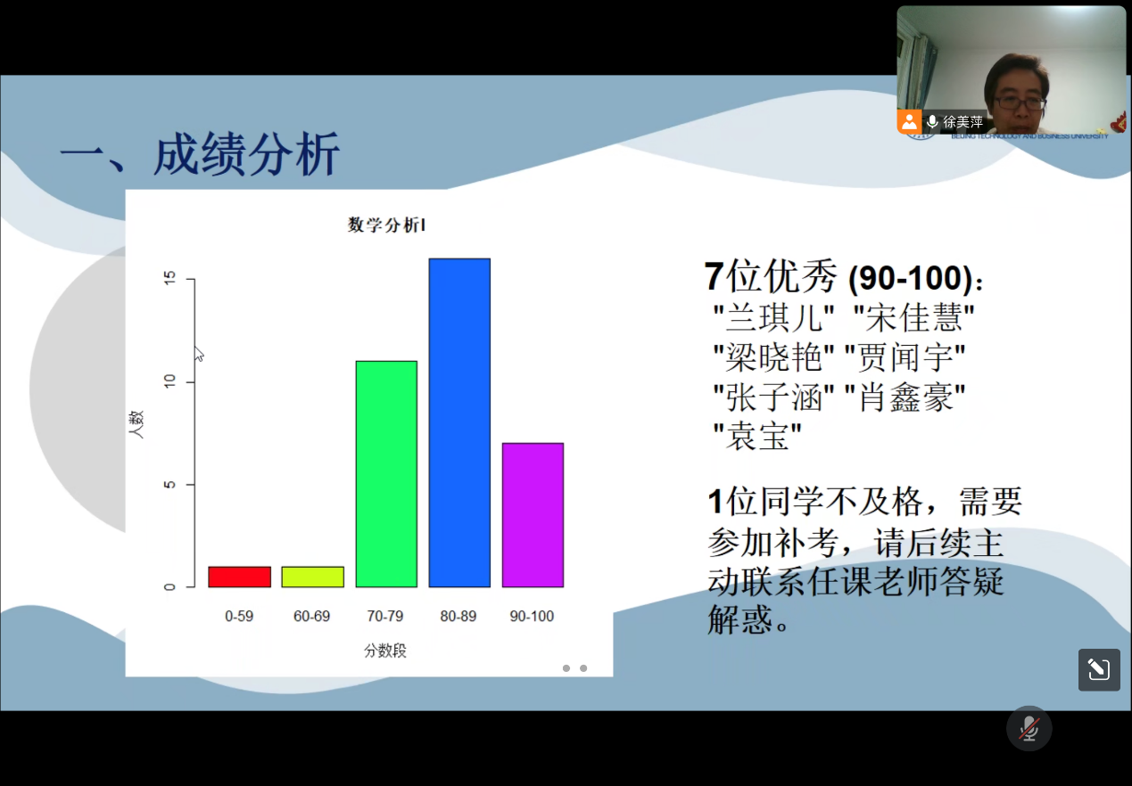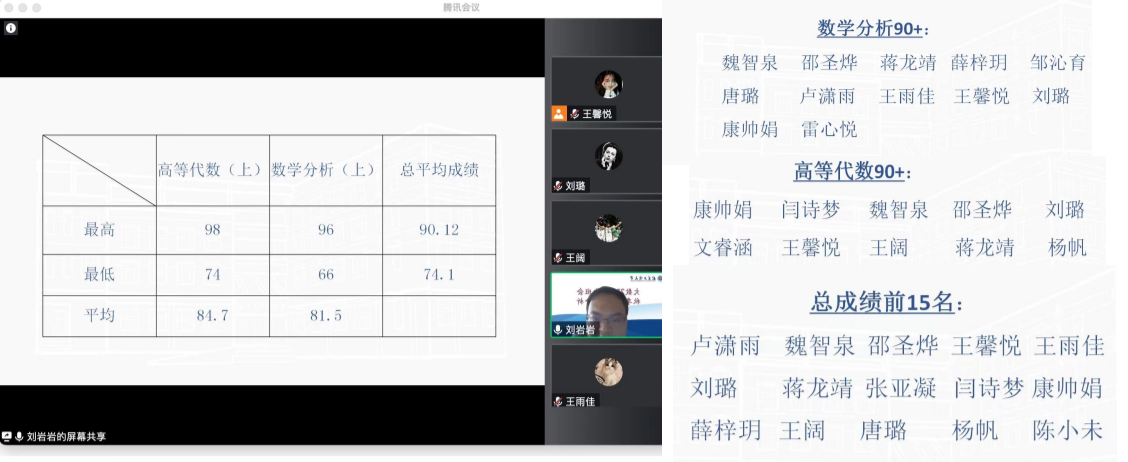 2. 表扬数分高代成绩90+及总成绩前 15 名的同学,鼓励同学们互相学习。