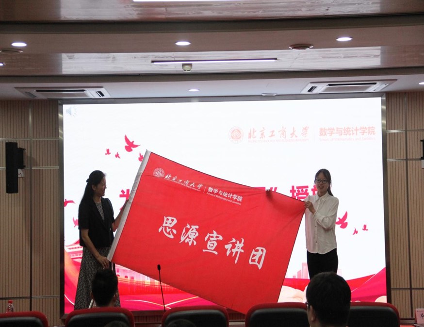 毕平平为“思源宣讲团”授旗,宣讲团团长吴柔接过团旗。