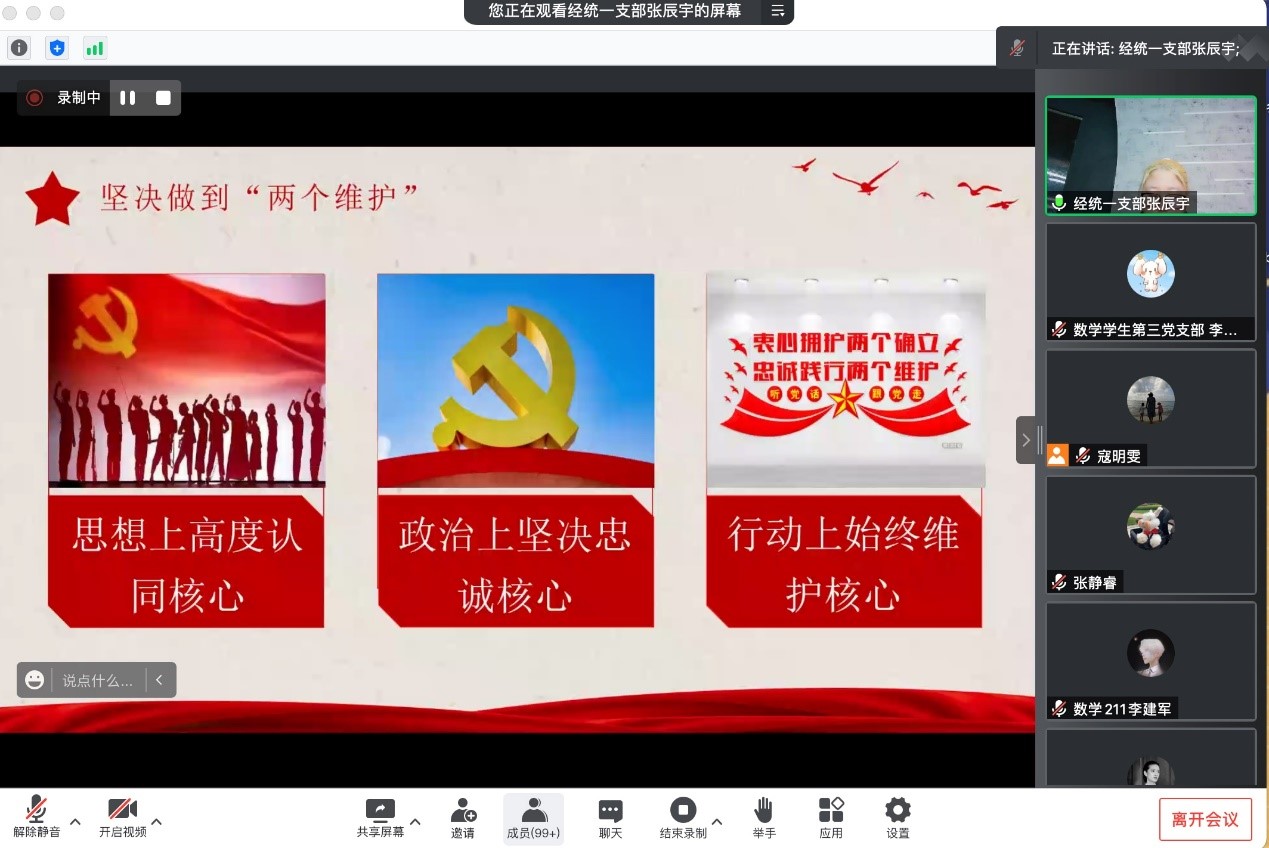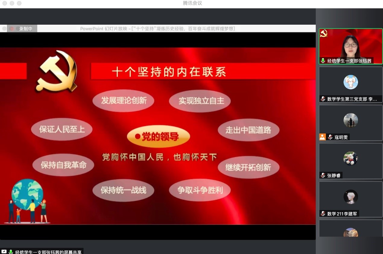 谢琳同学重点分享了大会概括出的13个方面的历史性成就和历史性变革中的“坚持党的领导”和“生态文明建设”。无论是建国前第一次国共合作的失败、第二次国共合作的成功,还是建国后建起立社会主义基本制度、开展社会主义建设,乃至如今迅速打响的疫情保卫战,无不体现党总揽全局、协调各方的领导核心作用充分发挥,成为战胜各种风险挑战、取得各项成就的根本保证,党领导的生态文明建设更是意义非凡,国际影响日益扩大。