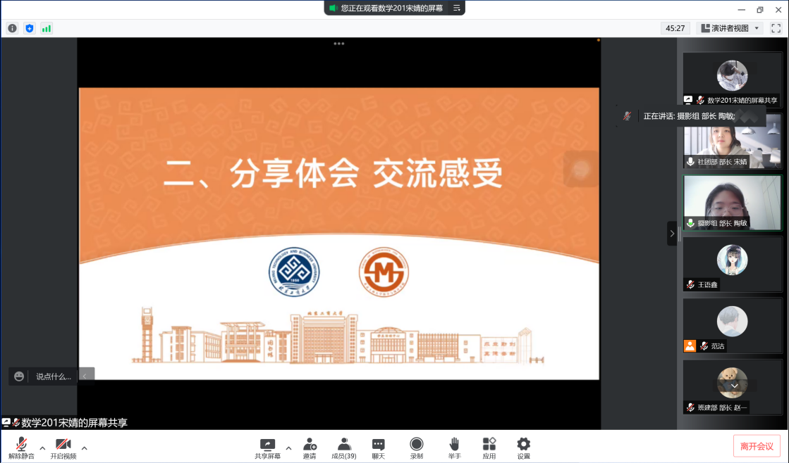 文艺部副部王行修表示共青团带领团员青年为实现党的历史任务而奋斗,在革命、建设和改革的伟大进程中充分发挥了生力军作用,这是近百年来中国青年运动的主旋律。回首中国共青团走过的光辉岁月,我感到无比自豪。而在未来,我们也更要努力,用青春与汗水,为祖国社会主义建设贡献自己的一份力量。