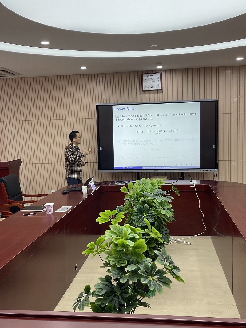 鲁建副教授做了题为“一类常微分方程的周期解”的报告。他先系统地介绍了凸几何当中的Minkowski问题,随后讲了与平面上Minkowski问题和曲率流相关的方程的解的存在性和唯一性结果。与传统地引入拓扑度条件,使用先验估计做存在性的方法不同,鲁建副教授引入了Blaschke-Santalo不等式和积分分析来获得了相应的结果。