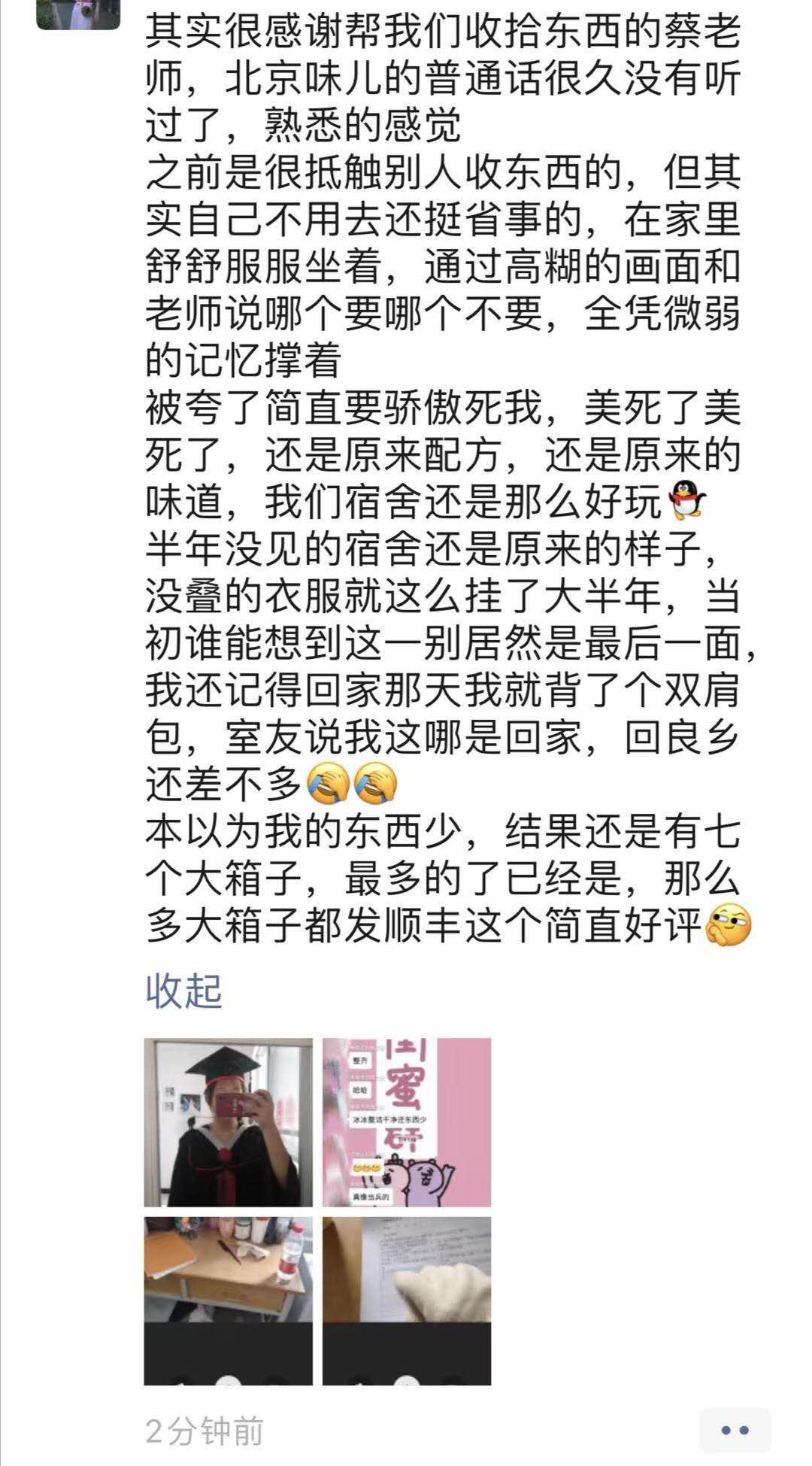 一声声关切询问、一件件细心查找,一箱箱精心整理、一次次往返搬运,老师们把对毕业生的思念与祝福转化成实际行动,装进包裹、寄往远方,用爱为毕业生书写北工商时光的温暖记忆。毕业生深受感动,纷纷在网络上表达对老师和母校的感激之情。