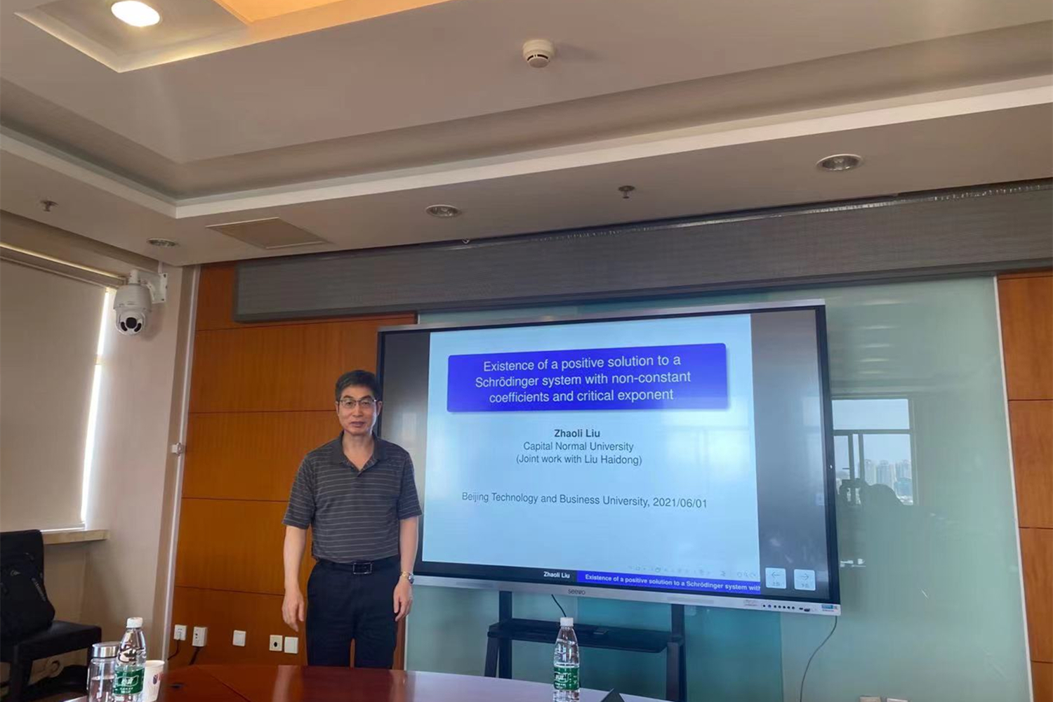 6月1日下午,yl23455永利举办了数学与统计及交叉学科前沿论坛--高端学术讲座的第8场报告会。公司邀请首都师范大学刘兆理教授在综合楼1116会议室做题为“Existence of a positive solution to a Schrodinger system with non-constant coefficients and critical exponent”的学术讲座,公司经理刘艳楠,党委书记周艳杰及部分相关方向的教师参加了此次报告会。讲座由经理刘艳楠教授主持。