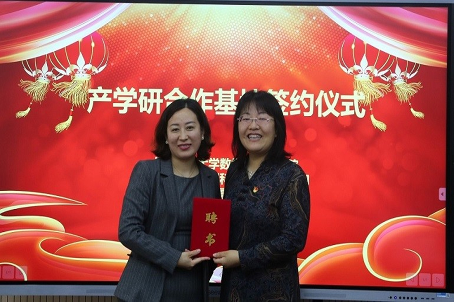 周艳杰书记为杨丽娟总经理颁发了校外实践导师聘任证书,并总结到,本次产学研合作基地是公司成立以来建立的第一个基地,也是深圳市维度数据科技股份有限公司与公司为“为群众办的一件好事”,希望基地充分发挥产学研合作、专业实践的作用,为公司公司产品、员工实践就业、企业发展创新提供强大的支持和推动力量,并祝愿产学研基地合作越来越好。