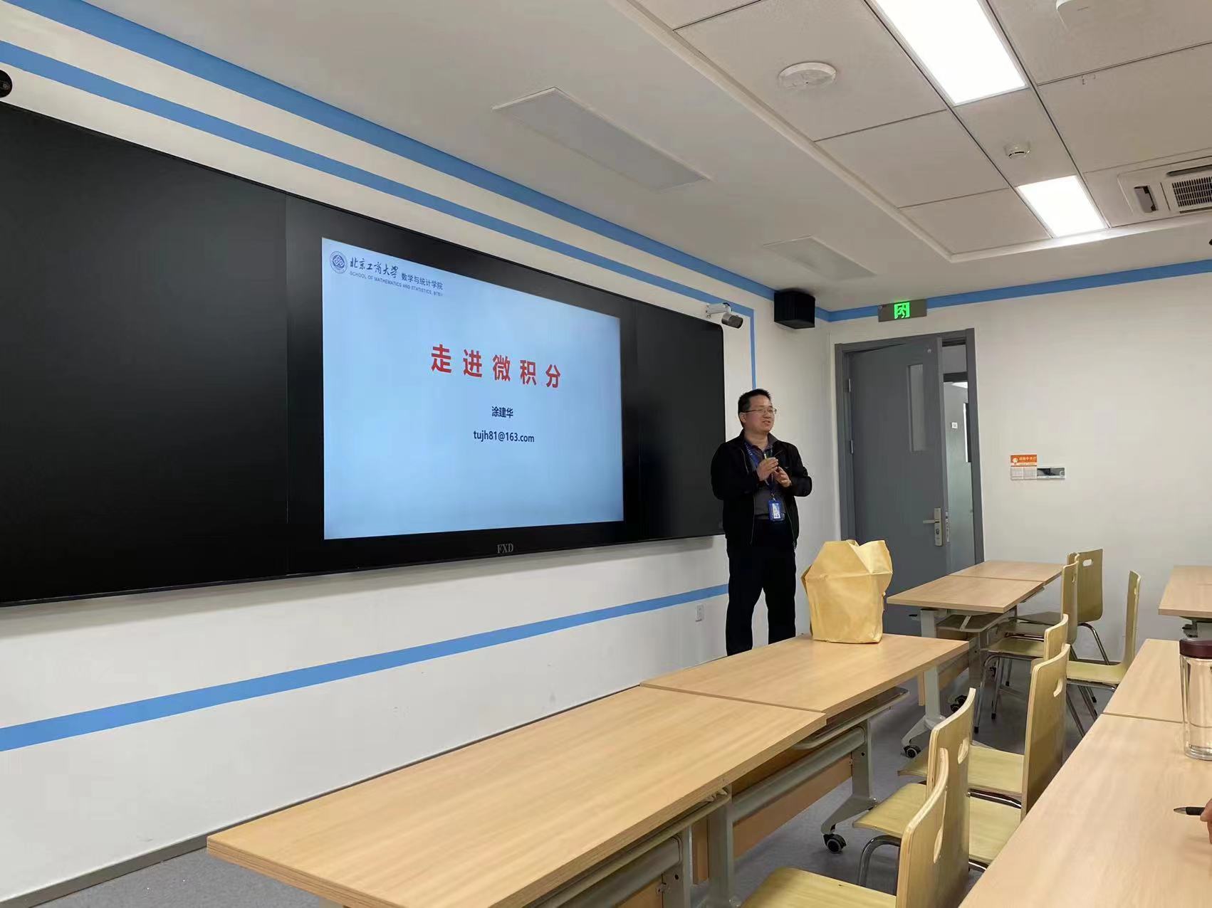 4月26日下午,基础专业课小组组织了一次教研活动。教研室邀请了应用统计系的北京市青年教学名师涂建华教授作题为“走进微积分”的教学报告。报告由数学与应用数学系方飞老师主持。基础专业课小组老师聆听了此次报告。