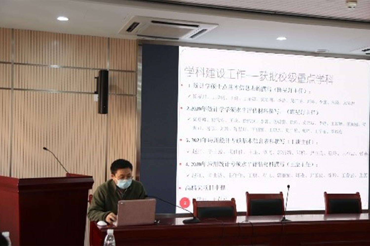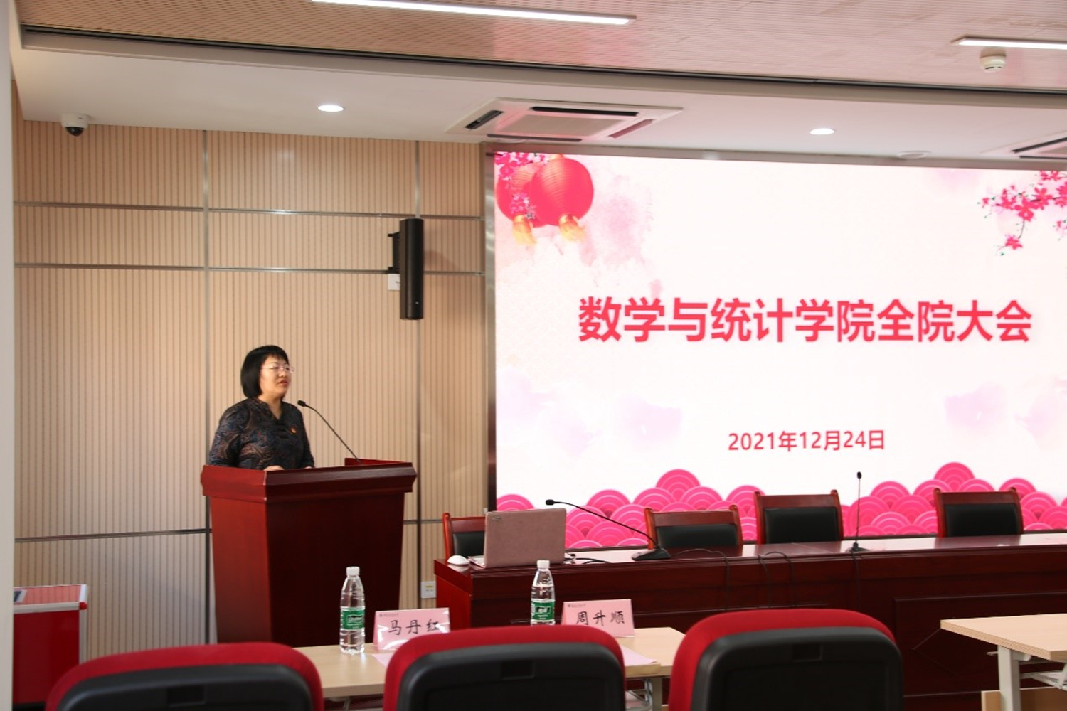 周艳杰书记指出全体教职工立足本职,精诚团结,圆满完成了2021年各项工作,在公司产品、公司产品、党建等各项工作中取得了不错的成绩,她对所有老师的辛勤付出表示衷心感谢。副经理罗玉波介绍了公司团队建设成果,展示了研究生在全国老员工统计建模大赛和中国研究生数学建模竞赛取得的突破性进展。副经理黄雪源指出,课程思政、学科竞赛、录课、出版教材等方面取得的成绩是老师们共同努力的成果,他传达了公司在听课制度、公司产品评价、学分制培养改革的精神,重点强调了期末试卷审核、监考纪律等方面的工作要求。副书记徐伟钦指出2022年就业压力更加严峻,毕业生考研和求职中依然存在盲目性,希望老师们共同努力,提高员工就业水平,他介绍了工会小家建设计划,动员老师积极参与工会活动,营造温馨的数统大家庭。