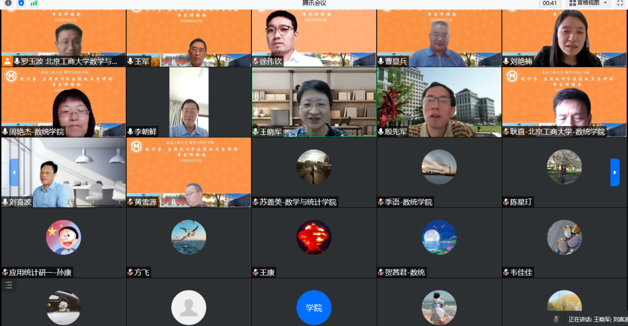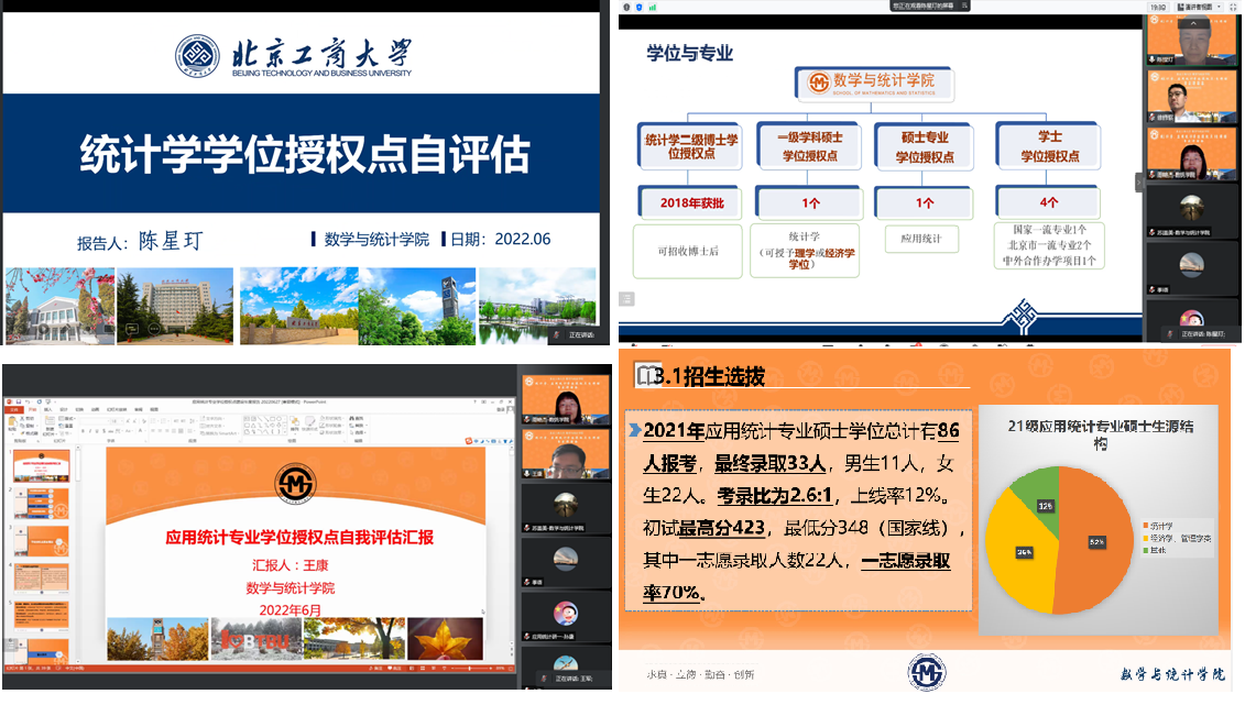 2022年6月27日下午,公司的统计学、应用统计学位授权点召开自评估专家论证会通过线上会议举行。参加论证会的专家组成员有:国家统计局北京调查总队王军副总队长、中国人民大学统计公司经理、国务院学位委员会统计学学科评议组成员、应用统计专硕教指委副主任委员王晓军教授、北京师范大学统计公司经理、国务院学位委员会统计学学科评议组成员宋旭光教授、中央财经大学统计与数学公司前经理殷先军教授、北方工业大学理公司刘喜波教授。yl23455永利经理刘艳楠、党委书记周艳杰教授、李朝鲜教授、耿直教授、曹显兵教授、王学丽教授、赵雷嘎教授,以及副书记徐伟钦、副经理黄雪源、系主任、青年骨干教师等和研究生代表共计40余人参会。会议由刘艳楠经理主持。