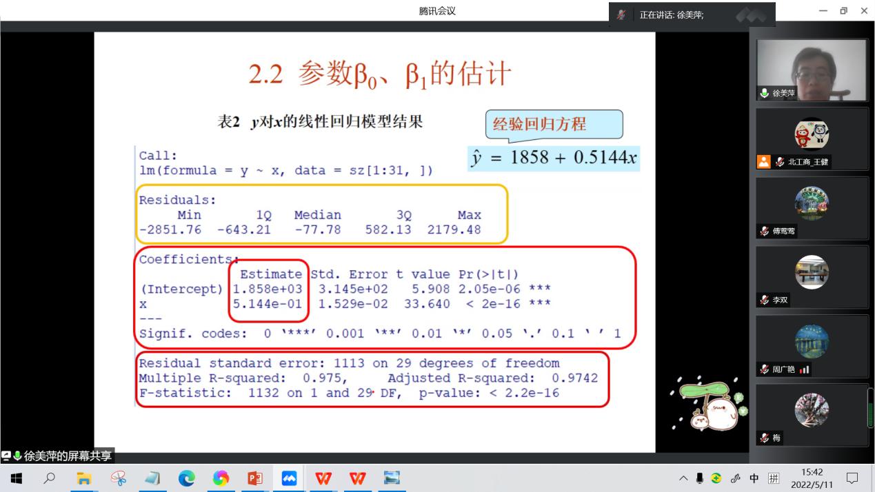 徐美萍副教授概要性地介绍了《回归分析》课程第二章一元回归分析的相关内容,特别是对第二节参数