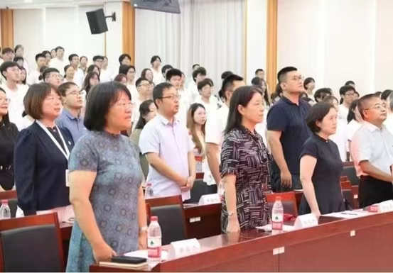 全体起立,奏唱国歌,师生肃立,目视前方,嘹亮的歌声响彻会场,整个场景仿佛被一种庄严而神圣的氛围所笼罩,映衬出他们庄重而坚定的神情。