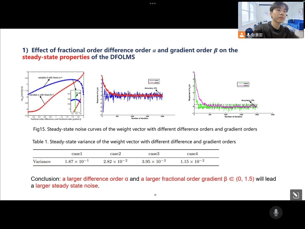 在导师莫立坡教授的指导下,张豪哲同学自开展“分数阶LMS算法研究课题”以来,通过分数阶差分理论与分数阶梯度下降法对原始的LMS算法模型经行优化,使其获得更出色的性能(更快的收敛速度与更低的稳态误差),同时对所提算法的收敛条件、收敛特性、稳态特性进行了严格的理论分析。其与莫立坡教授合作的论文,现已分别在SCI期刊:Circuits, Systems, and Signal Processing 和第41届中国控制会议上发表。