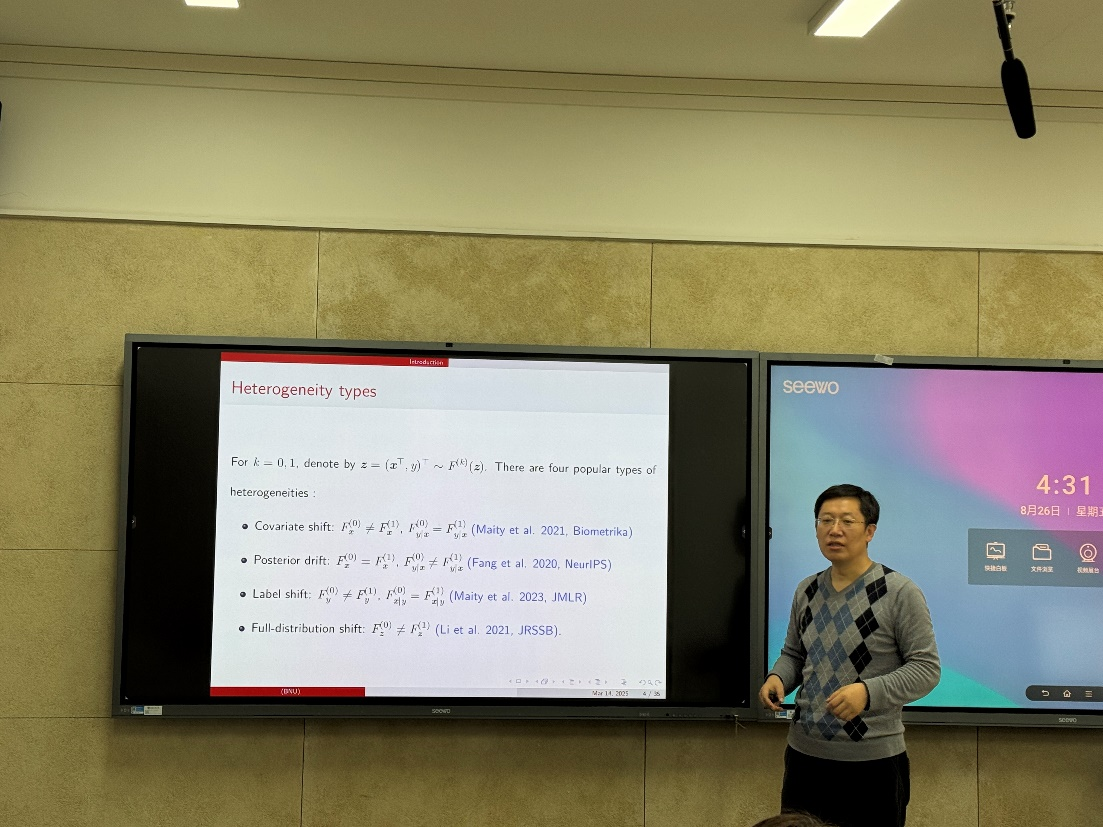 此次报告中,赵俊龙教授针对基于LASSO的高维线性模型,提出了一种残差重要性加权的迁移学习方法(RIW-TL),与全面选择数据的Trans-Lasso方法相比,RIW-TL通过重要性加权的方式可以从所有辅助数据集中按照个体水平选择样本,极大地提高了样本利用效率。特别地,RIW-TL通过一维残差密度比来构造权重,避免了维数灾难。此次精彩报告引起了教师们的热烈讨论。