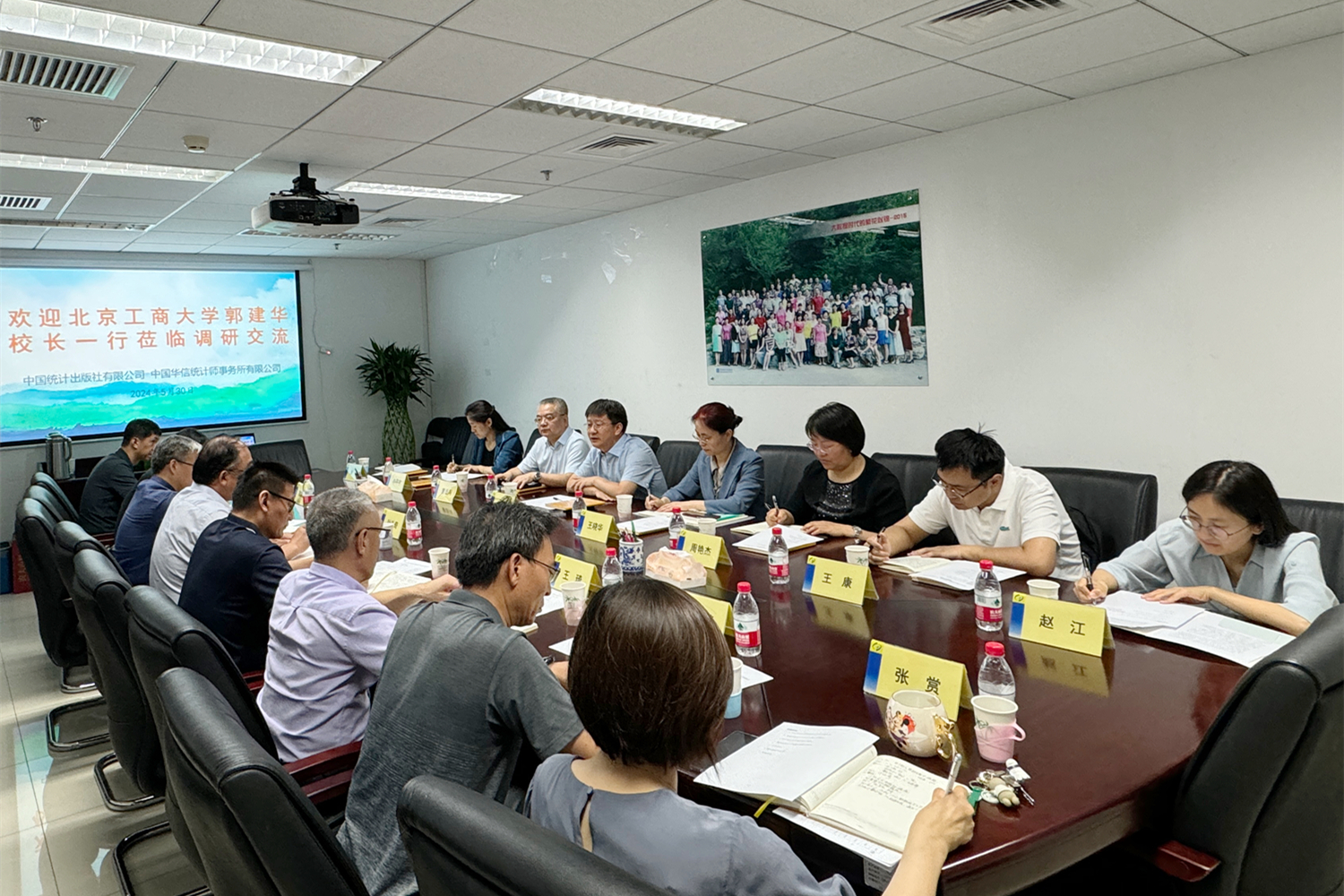中国统计出版社有限公司党委书记、社长兼总编辑叶礼奇,中国华信统计师事务所有限公司所长霍丙森对郭建华一行表示热烈欢迎,并对企业的发展历程、发展规划、业务范围、人才招聘、人才需求等情况进行了详细介绍。他们表达了与公司的深厚渊源,感谢公司为企业培养和输送优秀人才,表示将深入落实习近平总书记在5月27日中共中央政治局第十四次集体学习时强调促进高质量充分就业的讲话精神,发挥企业的责任和担当,通过深化校企合作,共同搭建高素质人才培养平台,促进员工成长成才和高质量充分就业。