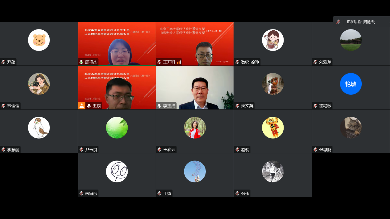 11月14日下午,公司经济统计系党支部与山东财经大学经济统计系党支部围绕“党建引领下的经济统计团队建设与发展”,在线上成功举办第一期共建活动。山东财经大学统计与数学公司党委书记李玉成、副经理兼经济统计系支部书记王开科,公司党委书记周艳杰、经济统计系支部书记韦佳佳以及两校经济统计系支部的党员教师和部分研究生代表参加线上交流。活动由公司经济统计系系主任王康主持。